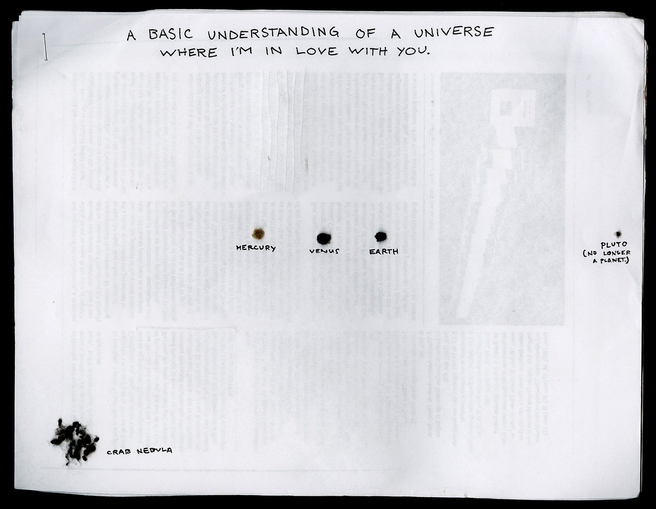A Basic Understanding is an 20″ x 16″ inkjet print in an edition of 5. It depicts a drawing by the artist of his fanciful vision of the planets and stars in the universe.
