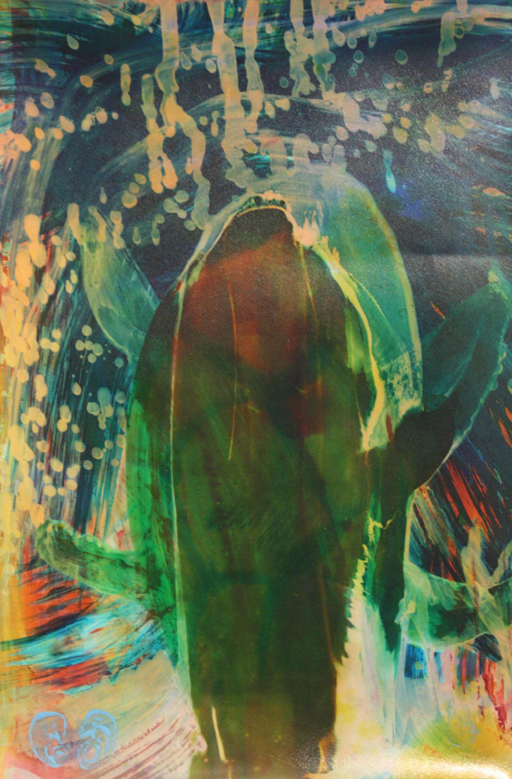 Skyhopping was made using dye-based inks and flashe on UV-sealed RC paper. This abstract composition is part of Ganster’s Brighton Beach series exploring the magic of the undersea world and the human impact on it.
